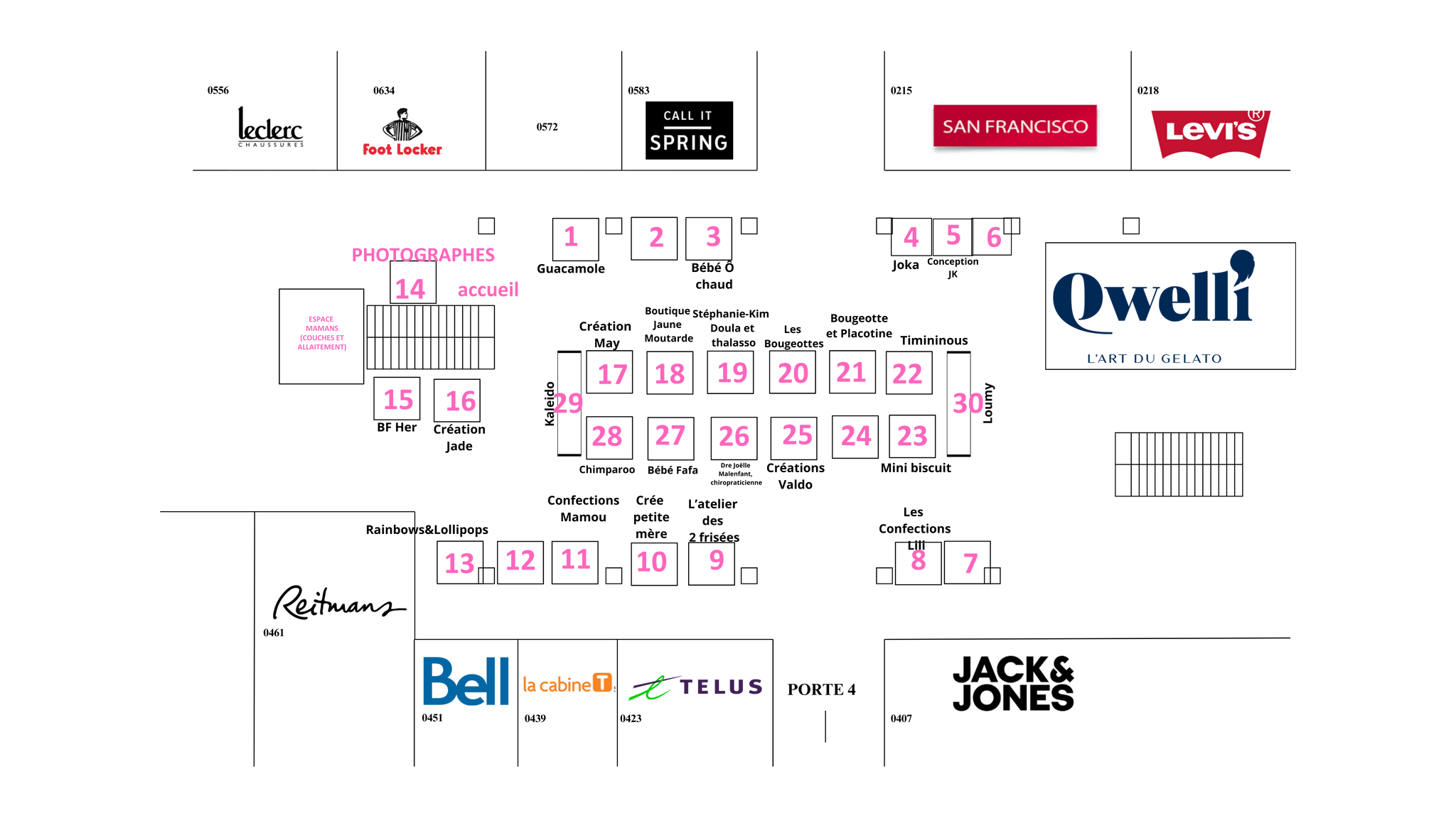 Espace de 16 pi × 4 pi. Vous serrez situé juste en bas des escaliers roulants. 1 entreprise à chaque extrémité.